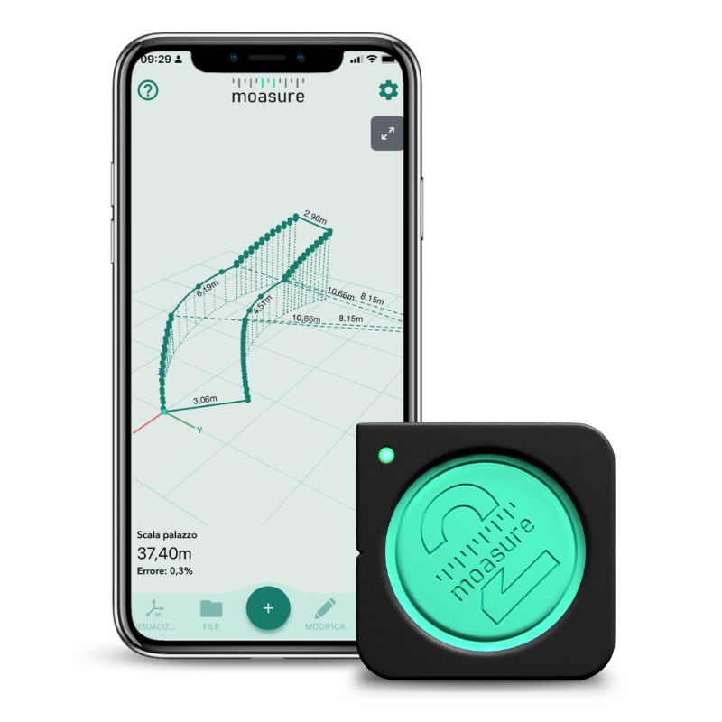 Moasure cattura spazi tridimensionali con facilità e permette di rivederli sullo schermo. È facile calcolare la pendenza, la salita e la discesa o il dislivello tra due punti qualsiasi.