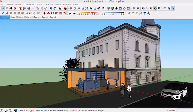Con la funzione Abbina foto di SketchUp puoi realizzare foto-inserimenti e modellazioni a partire da una foto, mettendola in scala e ricalcandone la geometria con gli strumenti di disegno di SketchUp Pro.